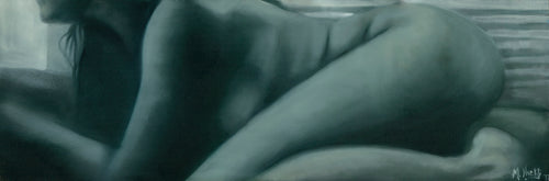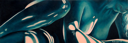 Original oil on canvas paintings focusing on figurative forms against botanical and geometric patterns.